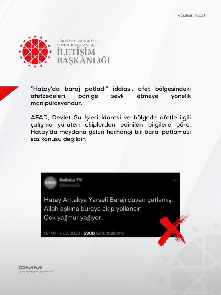 Sosyal medyada hızla yayılan “Hatay'da baraj patladı” haberinin bütünüyle asılsız olduğu ortaya çıktı. Bu iddianın bölgedeki afetzedeleri paniğe sevk etmek amacıyla üretilmiş bir manipülasyon olduğu, AFAD ve Devlet Su İşleri verileriyle kanıtlandı.