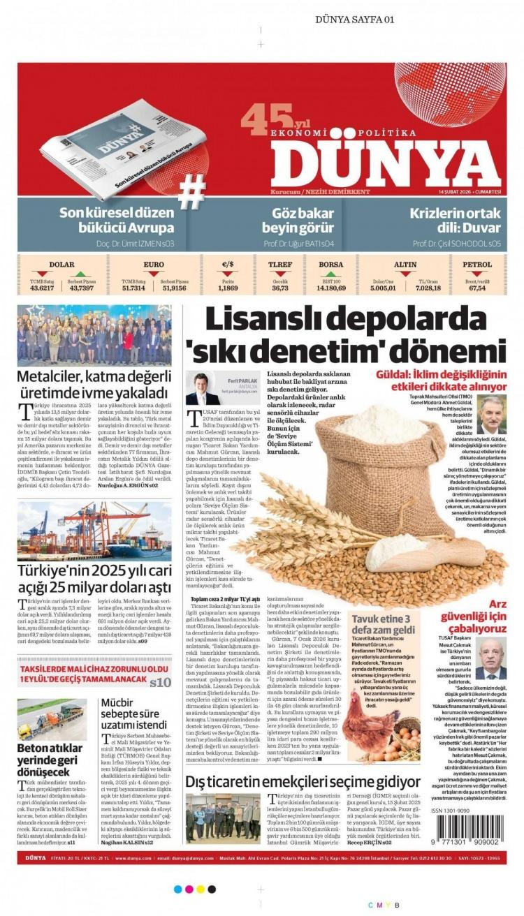 14 Şubat Cumartesi 2026 Gazete Manşetleri