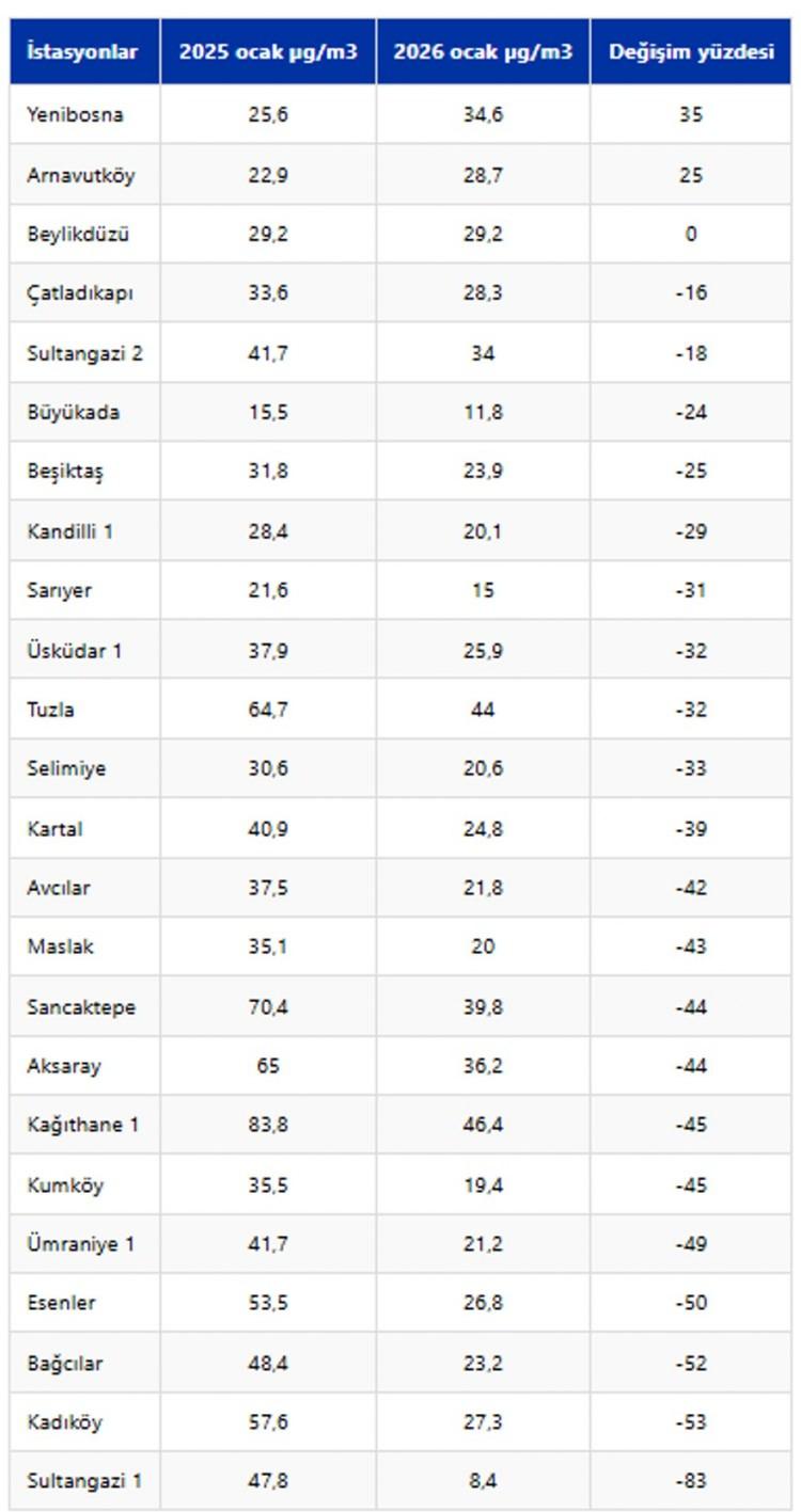 İstanbul'da bulunan istasyonların hava kirliliği partiküler madde ortalaması şu şekilde: