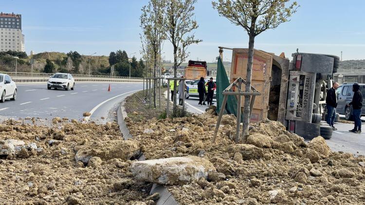 Başakşehir'de hafriyat kamyonu devrildi, tonlarca toprak yola saçıldı