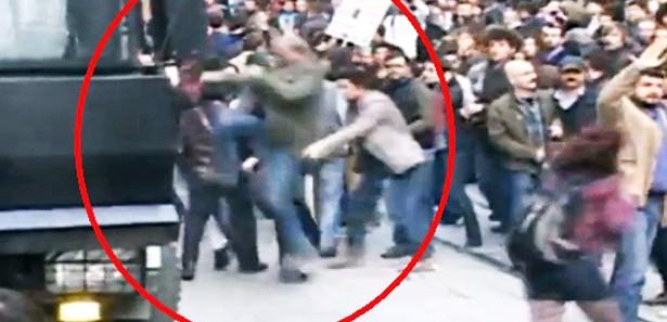 Odatv davasının tutuksuz sanığı Ahmet Şık, Emek sineması önünde yaşanan arbedede polis panzerine tekme atarken kameralara böyle takıldı.
