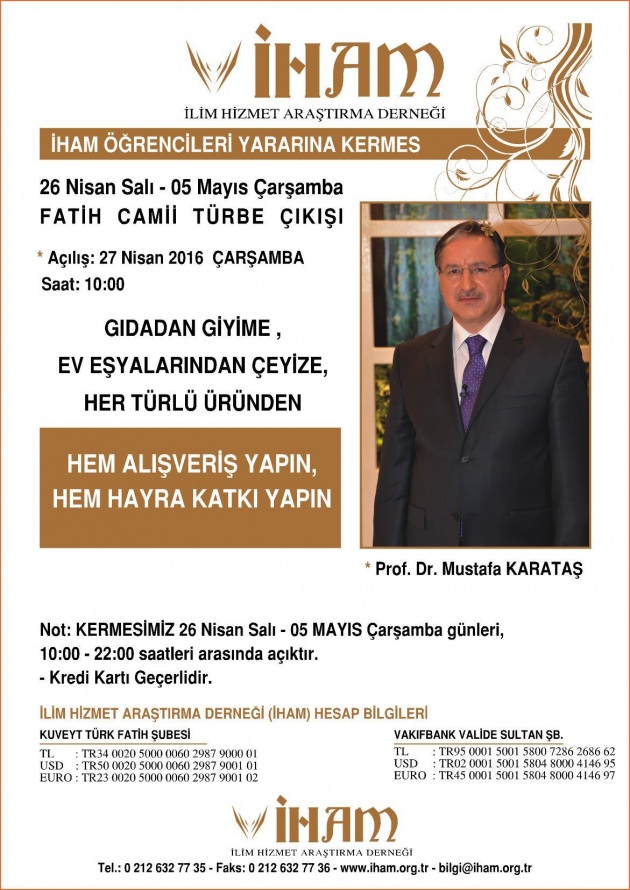 İlim Hizmet Araştırma Derneği'nden (İHAM) yapılan açıklamada 26 Nisan Salı-5 Çarşamba tarihleri arasında İstanbul Fatih Camii Türbe çıkışında İHAM öğrencileri yararına bir kermes düzenleneceği belirtildi.
