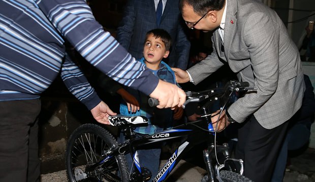 Cumhurbaşkanı Erdoğan adına getirdiği bisikleti Suriyeli Hasan'a hediye eden Vali Toprak, bir süre çocuğun bisiklete binmesine yardımcı oldu.