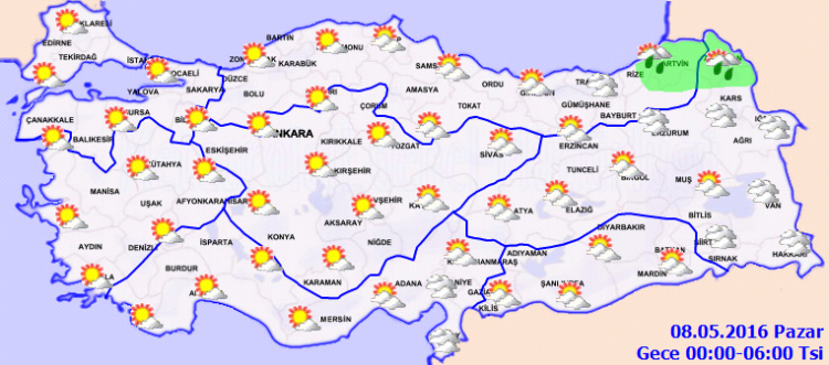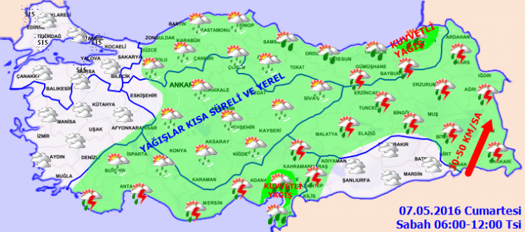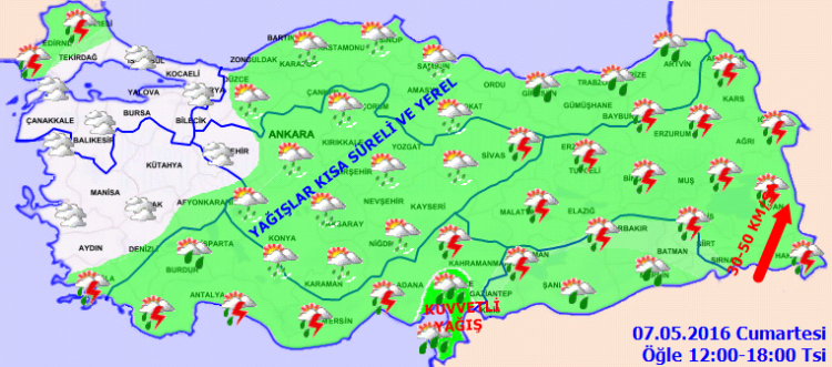 Meteoroloji Genel Müdürlüğü'nün internet sitesisinde yer alan verilere göre yurdun için kesimlerinde ve doğusunda yağışlar kısa süreli devam edecek. Aşağıdaki grafiklerden 7 Mayıs 2016 sabah, öğlen ve akşam saatlerinde yurt genelindeki hava tahminlerine ulaşabilirsiniz.