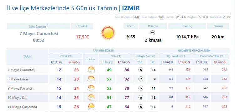 MGM intetnet sitesinde yer alan tahminlere göre İzmir için 5 günlük hava tahmini: