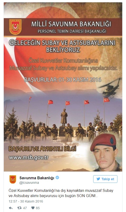 Milli Savunma Bakanlığının resmi Twitter hesabından yapılan açıklamada, Özel Kuvvetler Komutanlığına dış kaynaktan muvazzaf subay ve astsubay alımı başvurusu için bugün son gün olduğu bildirildi.