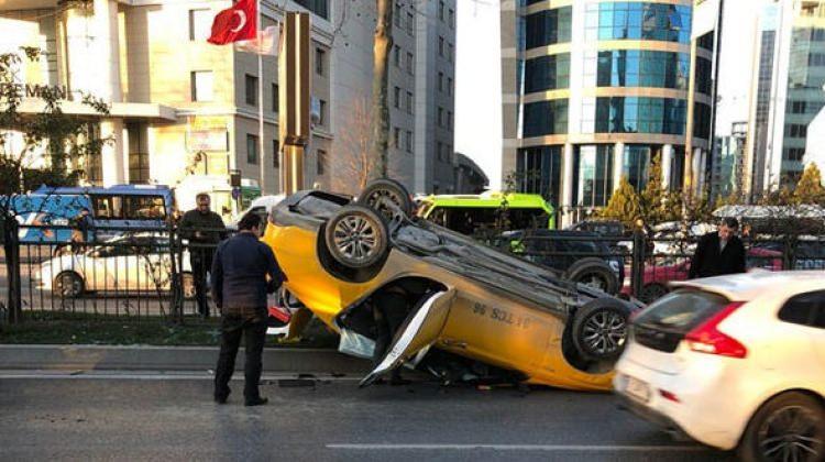 Maslak yönünde Kanyon AVM yakınlarında meydana gelen kazada, itfaiye ekipleri ters dönen taksideki vatandaşı araçtan çıkarmaya çalışıyor.