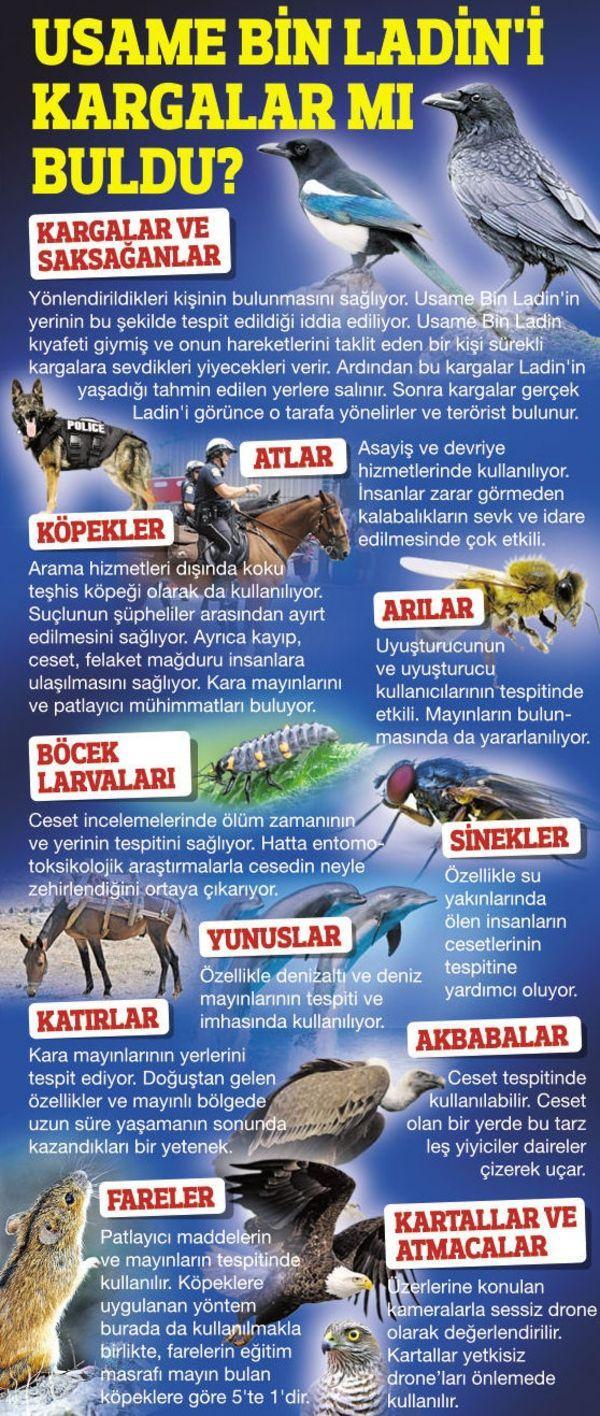 Kargalar ve saksağanlar yönlendirildikleri kişilerin bulunmasını sağlıyor. Usame Bin Ladin'in yerinin bu şekilde tespit edildiği iddia ediliyor.Usame bin Ladin kıyafeti giymiş ve onun hareketlerini taklit eden bir kişi sürekli kargalara sevdiği yiyecekler verir. Ardından bu kargalar Ladin'in yaşadığı tahmin edilen yerlere salınır. Sonra kargalar gerçek Ladin'i görünce o tarafa yönelirler ve terörist bulunur.
