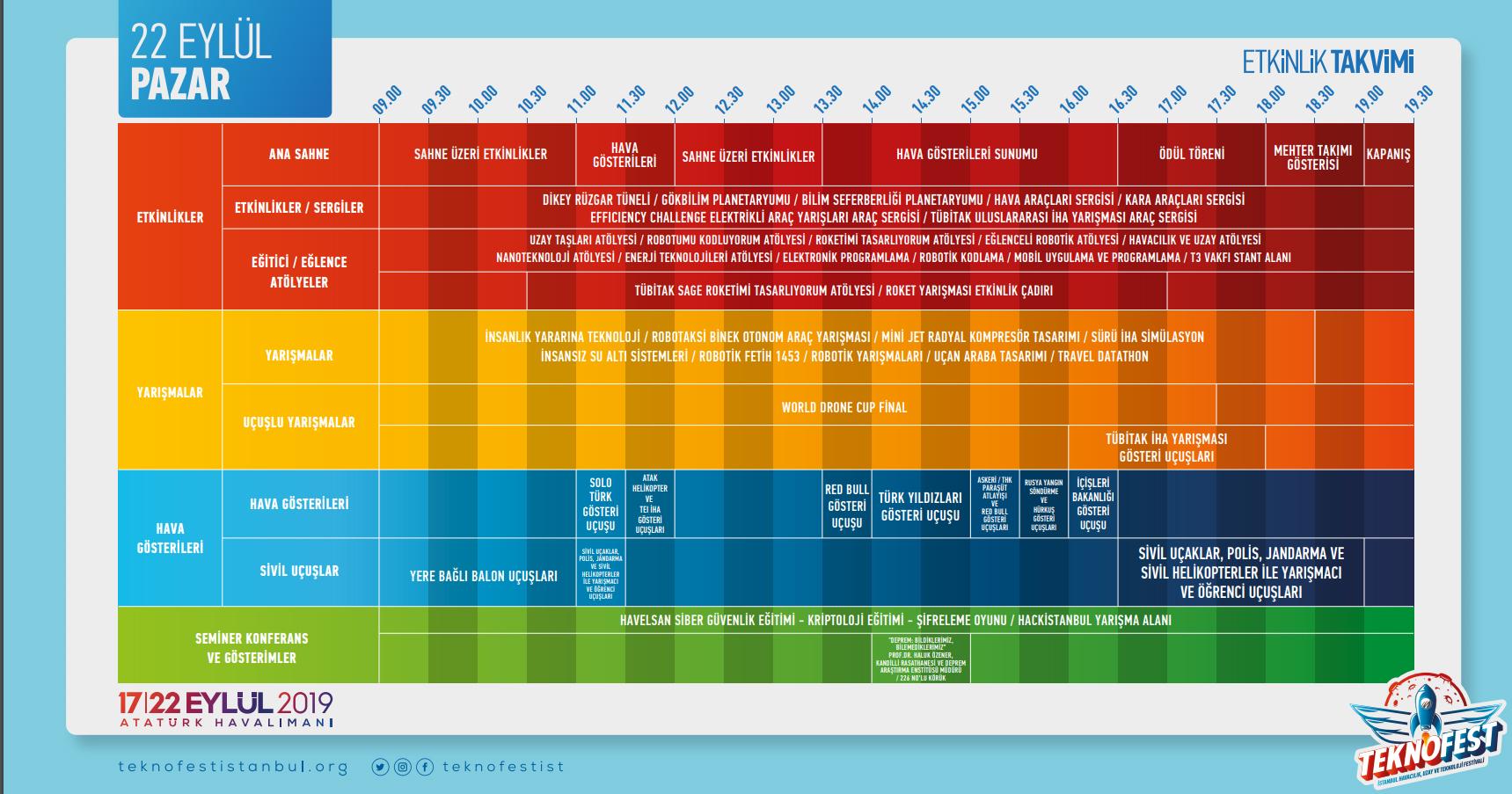 Festival kapsamında 19 farklı kategoride düzenlenen Türkiye tarihinin en büyük ödüllü teknoloji yarışmaları, Dünya Drone Kupası, Take Off Uluslararası Girişim Zirvesi, Hackİstanbul 2019, Solo Türk ve Türk Yıldızları nefes kesen gösterileri, dikey rüzgar tüneli, planetaryum, havacılık gösterileri, atölye çalışmaları, jandarma emniyet özel gösterileri, Atak Helikopteri Harmandalı, sergiler, konserler ve çok özel sürpriz etkinler gerçekleştirilecek.