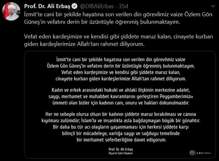 Erbaş, Twitter hesabından yaptığı paylaşımda, İzmit’te cani bir şekilde hayatına son verilen din görevlisi vaiz Özlem Gön Güneş’in vefatını derin bir üzüntüyle öğrendiğini belirterek "Vefat eden kardeşimize ve kendisi gibi şiddete maruz kalan, cinayete kurban giden kardeşlerimize Allah'tan rahmet diliyorum." ifadesini kullandı.