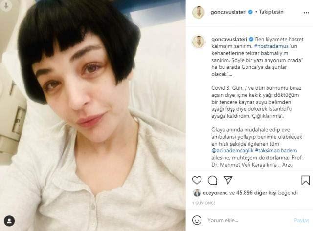 Koronaya yakalanan oyuncu Gonca Vuslateri rahat nefes alabilmek için sıcak suyun içine kekik yağı dökünce yaşadığı kazayı sosyal medyadan duyurdu.