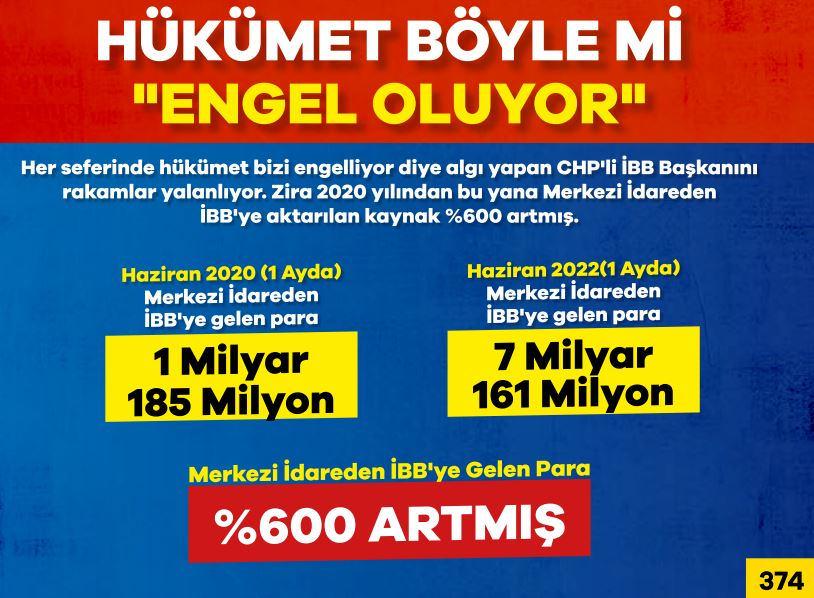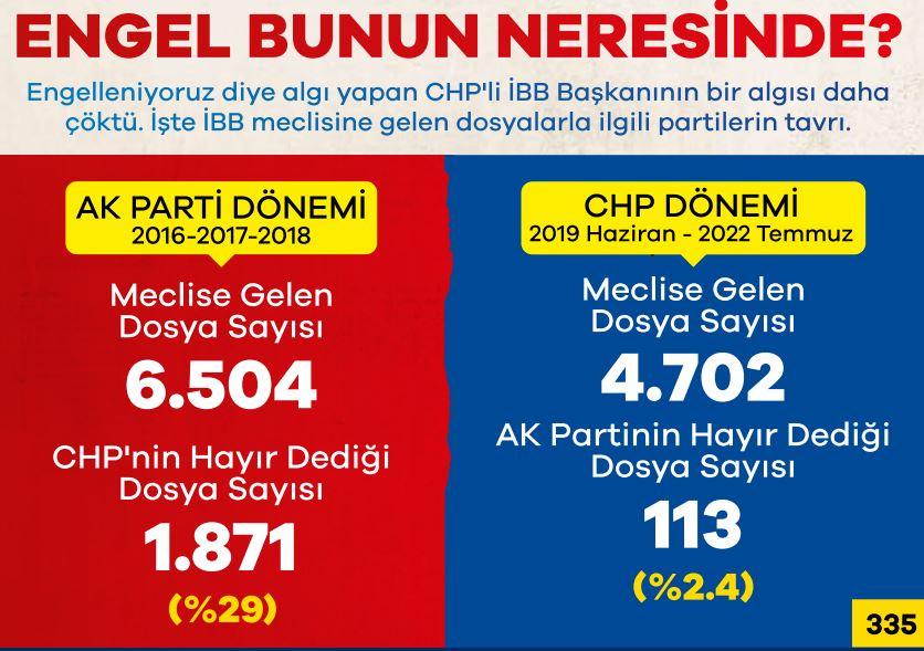 İki partinin net tavrını burada göreceğiz ve gerçek ortaya çıkacak. 2016-218 yıllarını kapsayan AK Parti döneminde meclise gelen dosya sayısı toplam 6.504. CHP bunların yüzde 29'una hayır dedi. 2019 -2022 yıllarını kapsayan yani CHP döneminde İBB Meclisine gelen dosya sayısı 4.702. Cumhur İttifakı ise bunların sadece yüzde 2.4'üne hayır dedi. Bunlar da yeşil alanların imara açılması ve satılması, LGBT Müdürlüğü kurulması veya dosyalardaki eksikliklerden kaynaklanıyor. Hani engel nerede? Aynı şekilde İBB Meclisi'ne gelen borçlanma dosyalarındaki evet, hayır oranında da müthiş bir fark var. Bizim zamanımızda borçlanma dosyalarının % 20'sine CHP hayır dedi. Biz ise borçlanma dosyalarının % 0.5'ine hayır dedik. Kim kimi engelliyormuş? Onları engelleyen yok. Ancak engel onların zihninde".