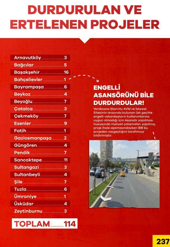 CHP'nin İstanbul için tutumunu da, "İptal ve durdurma", "İhmal ve geriye gidiş", "Algı, reklam ve israf", başlıkları altında görsellerle anlatan M. Tevfik Göksu, "Bu yönetim ilk olarak İstanbul için hayati öneme haiz projeleri iptal etmekle işe başlamıştır" dedi ve bunlara Silahtarağa İleri Biyolojik Atık Su Arıtma Tesisi Temel Atmama törenini, Levazım- Dolmabahçe Tüneli'nin durdurulmasını, Çekmeköy – Sancaktepe - Sultanbeyli Metro hattına beton dökülerek kapatılmasını ve dikey bahçelerin sökülmesini örnek verdi.