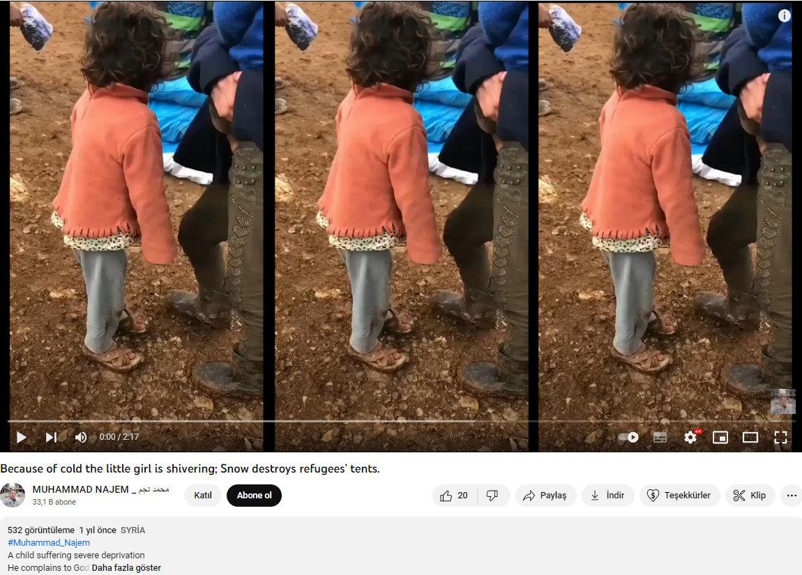 11 ilimizi etkileyen büyük deprem sonrası bazı sosyal medya hesaplarından üzerinde montu bile olmayan küçük bir kız çocuğunun soğukta titrediği görüntüler yayına sokularak görüntülerin Türkiye'deki deprem bölgesinde çekildiği iddia edilmişti. Görüntü izleyen herkesi derinden etkilerken büyük bir infiale neden oldu.
