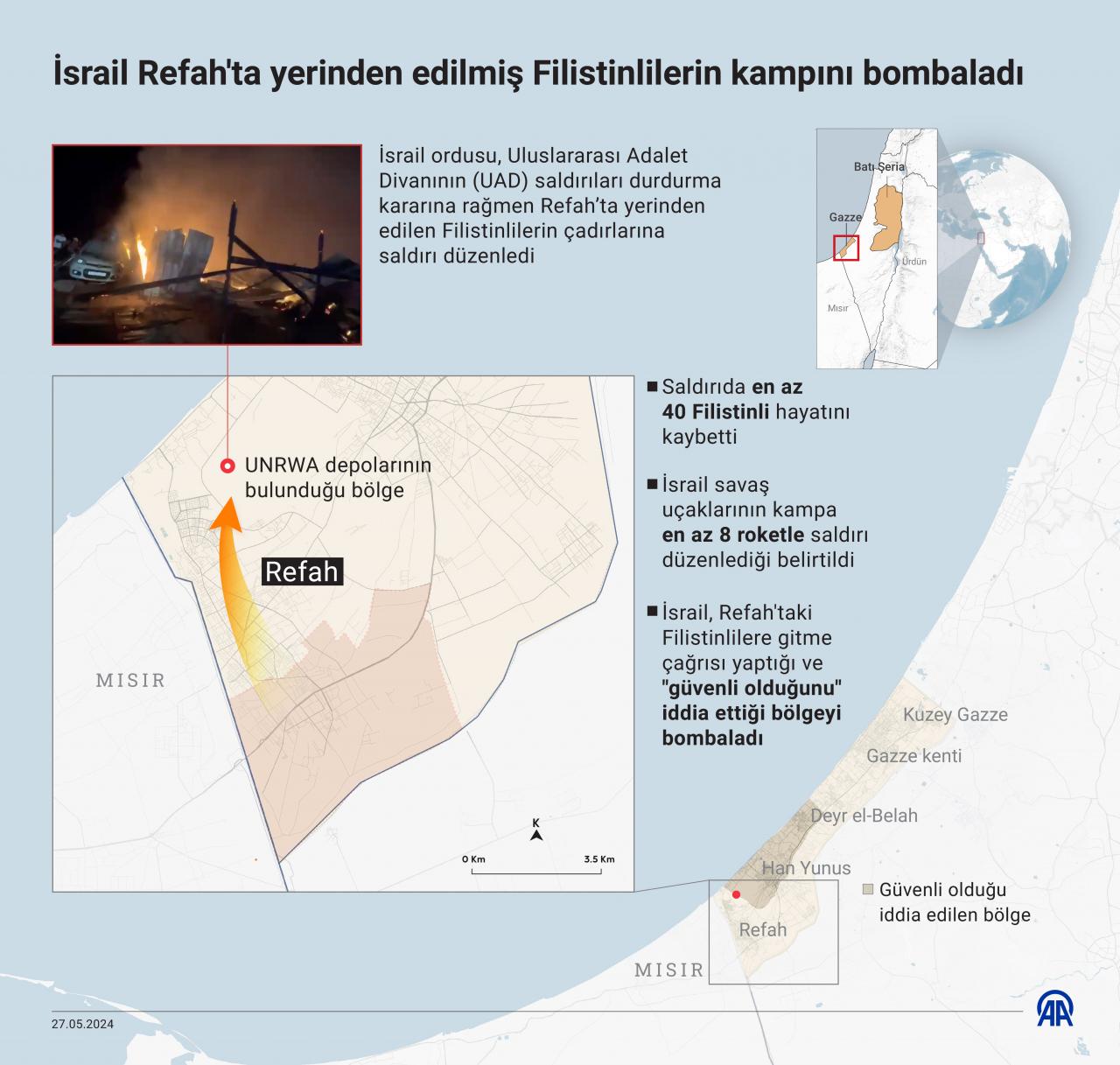 İsrail ordusunun, Uluslararası Adalet Divanının (UAD) saldırıları durdurma kararı aldığı Gazze Şeridi'ndeki Refah kentinde yerinden edilen Filistinlilerin çadırlarına düzenlediği saldırıda en az 40 Filistinli hayatını kaybetti.