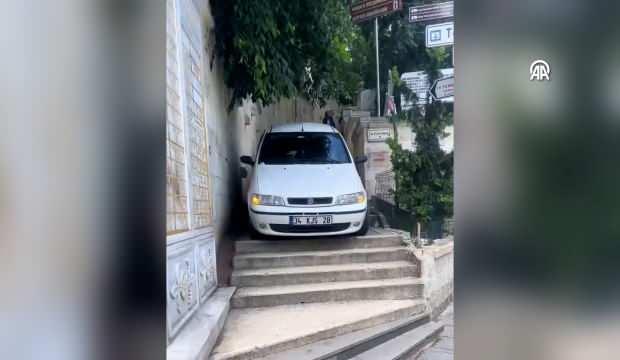 Görüntüde, merdivenleri kullanarak aracıyla belirli bir yere kadar gelen sürücünün, otomobilinin sinyallerini yakarak merdivenlerden inmeye çalışması yer aldı. Kayıtta ayrıca, vatandaşların "Çekilin oradan inecek, çarpabilir." şeklindeki konuşmaları da duyuldu.