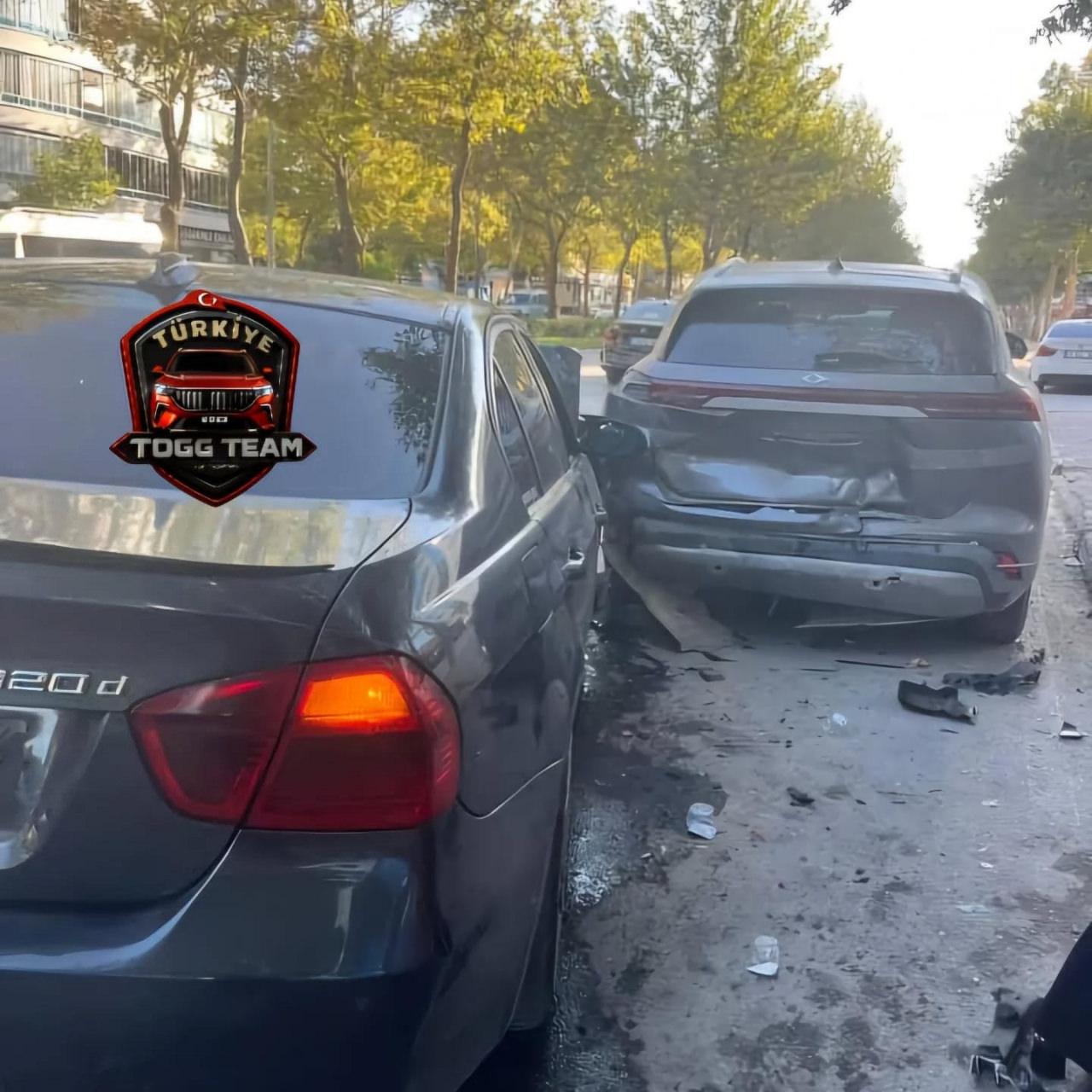 TOGG T10X'e arkadan çarptığı kazada BMW marka aracın ön tarafının paramparça olduğu görüldü.