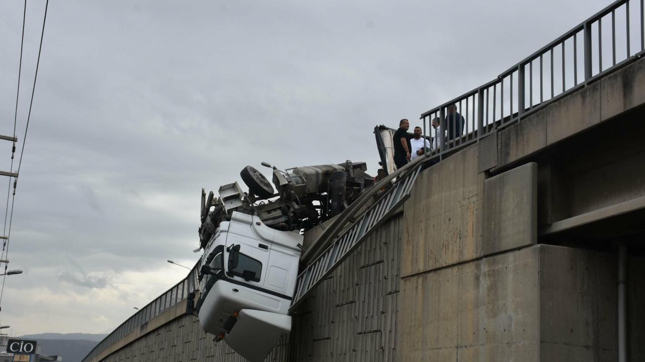 İzmir'in Bornova ilçesinde yağmur nedeniyle kayganlaşan yolda devrilen TIR'ın kupası viyadükte asılı kalırken, şoförü İrfan Öngen (48) yaralandı.