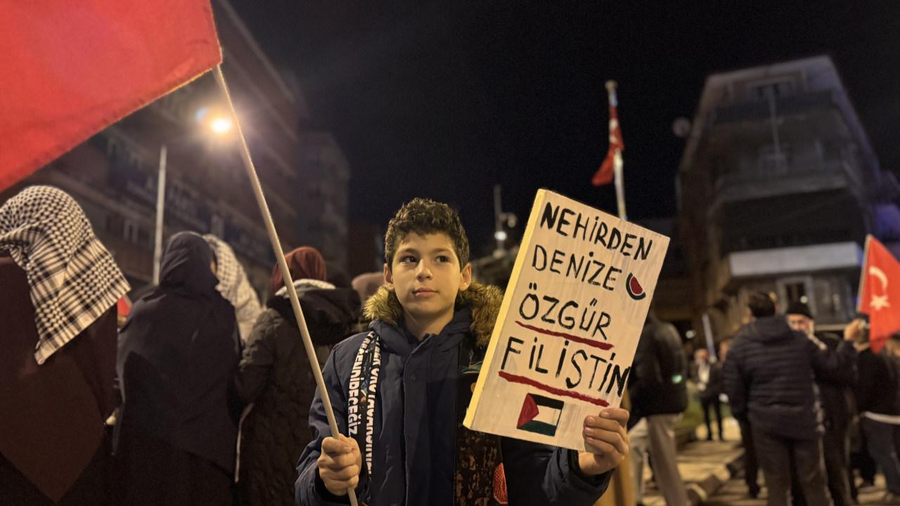 Ellerinde Türk ve Filistin bayrağı taşıyan grup, slogan atıp İsrail'e tepki gösterdi.