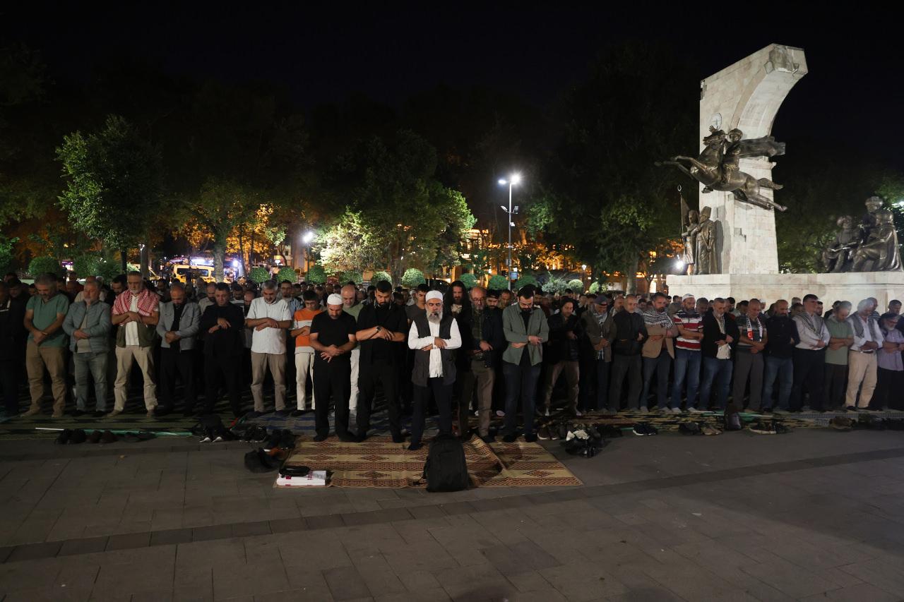 Fatih'teki Saraçhane Parkı'nda yatsı namazında toplanan katılımcılar Kur'an-ı Kerim okudu. Eylemde, İsrail'in saldırısı altındaki Filistin ve Gazzeliler için dua edildi.
