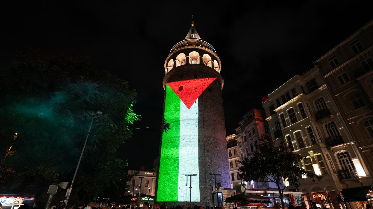 İstanbul'un simge yapılarından Galata Kulesi'nin cephesine mapping tekniğiyle Filistin bayrağı yansıtıldı.
