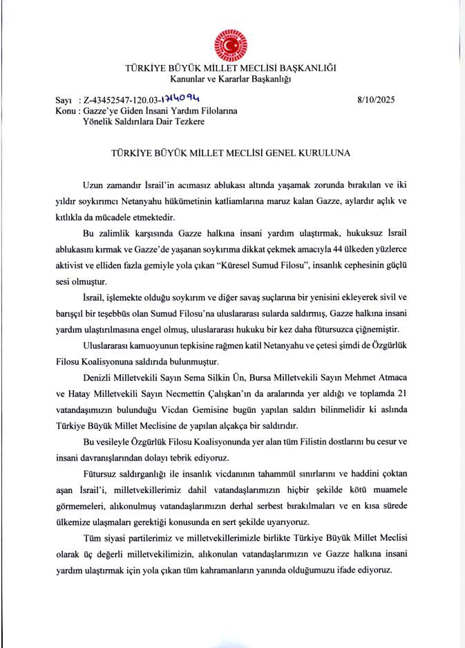 Son dakika haberi... TBMM Başkanı Numan Kurtulmuş'un imzasını taşıyan, Gazze'ye Giden İnsani Yardım Filolarına Yönelik Saldırılara Dair Meclis Başkanlığı tezkeresi oybirliğiyle kabul edildi.