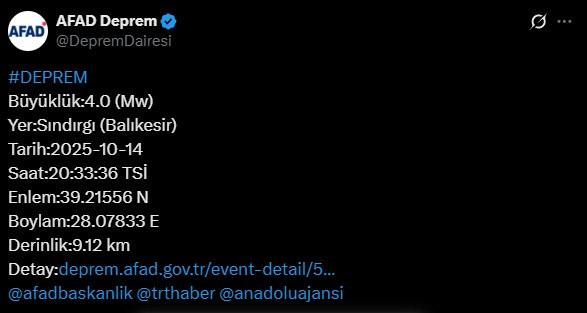 Son dakika: AFAD'dan yapılan açıklamaya göre, Balıkesir’in Sındırgı ilçesi merkezli 4.1 büyüklüğünde deprem meydana geldi.