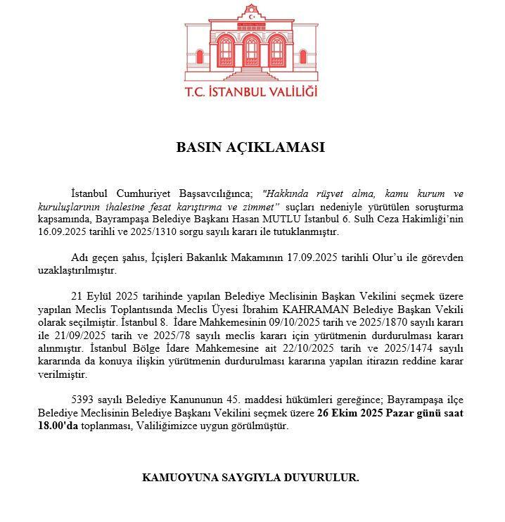 5393 sayılı Belediye Kanununun 45. maddesi hükümleri gereğince; Bayrampaşa ilçe Belediye Meclisinin Belediye Başkanı Vekilini seçmek üzere 26 Ekim 2025 Pazar günü saat 18.00'da toplanması, Valiliğimizce uygun görülmüştür.