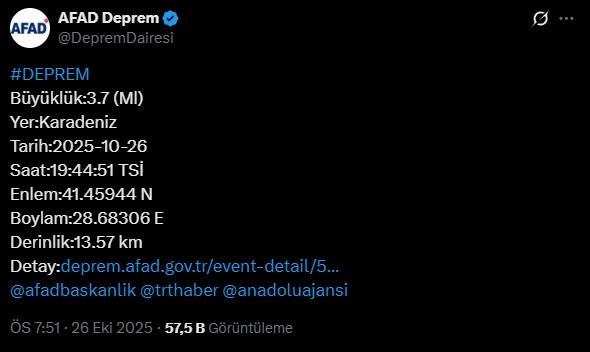 Afet ve Acil Durum Yönetimi Başkanlığı'nın (AFAD) internet sitesinde yer alan bilgiye göre, merkez üssü Karadeniz olan 3.7 büyüklüğünde bir sarsıntı kaydedildi. Saat 19.44'te gerçekleşen depremin, 13,57 kilometre derinlikte meydana geldiği belirlendi. Kandilli Rasathanesi ise depremin büyüklüğünü 3.9 olarak açıkladı.