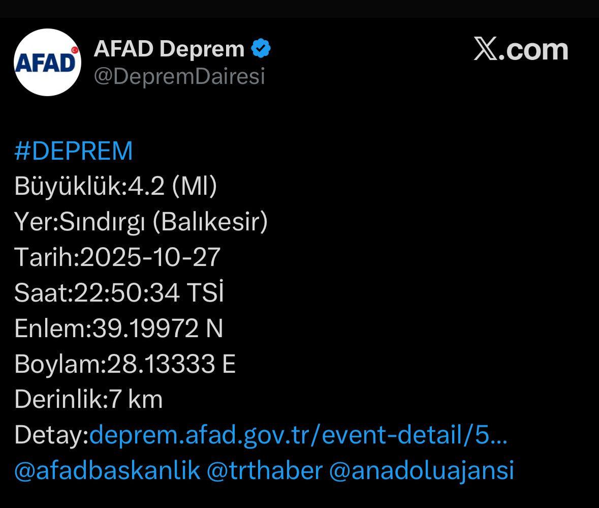 — AFAD Deprem (@DepremDairesi) October 27, 2025
