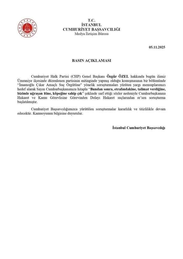 İstanbul Cumhuriyet Başsavcılığı, CHP Genel Başkanı Özgür Özel hakkında "Cumhurbaşkanına Hakaret" ve "Kamu Görevlisine Görevinden Dolayı Hakaret" suçlarından resen soruşturma başlattı.