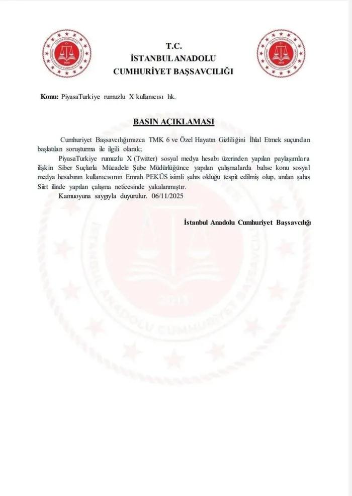 Başsavcılık dün, "PiyasaTurkiye" rumuzlu X sosyal medya hesabı üzerinden yapılan paylaşımlara ilişkin "TMK 6" ve "özel hayatın gizliliğini ihlal etmek" suçundan soruşturma başlatıldığını, Siber Suçlarla Mücadele Şube Müdürlüğünce yapılan çalışmalarda hesabın kullanıcısının Emrah Peküs olduğunun tespit edildiği ve Peküs'ün Siirt'te yakalandığını açıklamıştı.