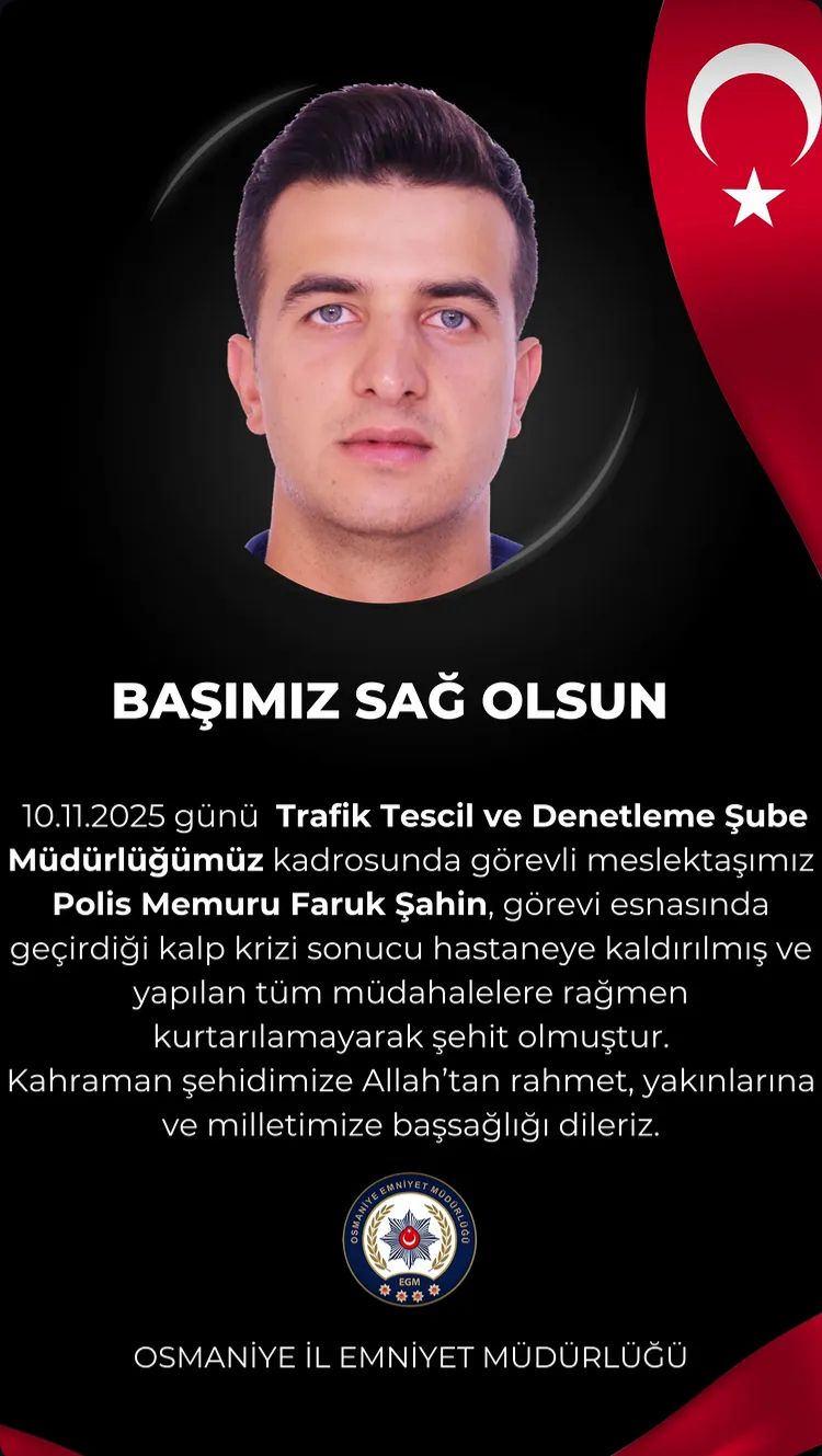 Osmaniye İl Emniyet Müdürlüğü tarafından paylaşılan başsağlığı mesajında, “10 Kasım günü Trafik Tescil ve Denetleme Şube Müdürlüğümüz kadrosunda görevli meslektaşımız polis memuru Faruk Şahin, görevi esnasında geçirdiği kalp krizi sonucu hastaneye kaldırılmış ve yapılan tüm müdahalelere rağmen kurtarılamayarak şehit olmuştur. Kahraman şehidimize Allah'tan rahmet, yakınlarına ve milletimize başsağlığı dileriz” denildi.