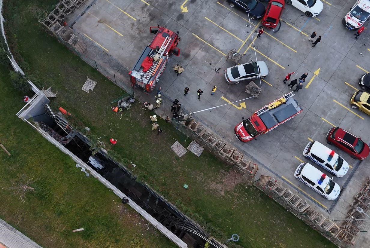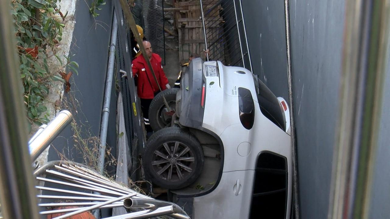 Bahçelievler'de otoparktan çıkarken direksiyon hakimiyetini kaybeden kadın sürücü, 9 araca çarpıp aracıyla birlikte boşluğa düştü.