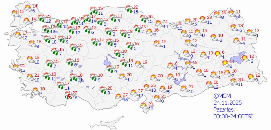 İstanbul, Yalova, Kocaeli, Bursa, Sakarya, Düzce, Yalova, Bolu, Bilecik, Kütahya, Uşak, Denizli, Burdur, Antalya, Isparta, Afyonkarahisar, Konya, Eskişehir, Karabük, Kastamonu, Çankırı, Kırıkkale, Ankara, Yozgat, Kırşehir, Karaman, Aksaray, Çorum, Samsun, Sinop, Amasya ve Mersin'de sağanak yağış bekleniyor.