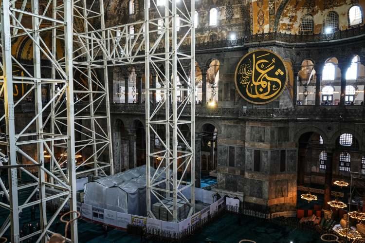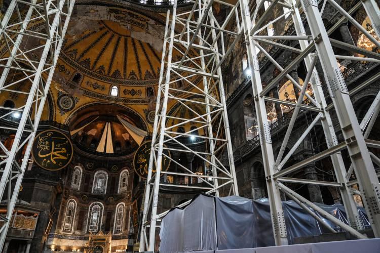 Açıklamada, "2023 yılında başlayan 2'nci etap restorasyon çalışmaları kapsamında Ayasofya'nın deprem güvenliğinin sağlanması amacıyla caminin ana kubbesinde dış yüzeyde kurşun kaplamalar yenilenirken, bu süreçte yapının mevsimsel koşullardan etkilenmemesi ve iç yüzeydeki mozaiklerin zarar görmemesi için kubbe yüzeyinin geçici çelik konstrüksiyon ile kapatılmasına Bilim Heyeti ve Koruma Kurulu tarafından karar verilmiştir" denildi.