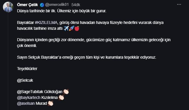 "Dünya tarihinde bir ilk. Ülkemiz için büyük bir gurur. Bayraktar KIZILELMA, görüş ötesi havadan havaya füzeyle hedefini vurarak dünya havacılık tarihine imza attı. Dünyanın içinden geçtiği zor dönemde, gücümüze güç katmamız ülkemizin geleceği için çok önemli. Sayın Selçuk Bayraktar'a, emeği geçen tüm kişi ve kurumlara teşekkür ediyoruz."