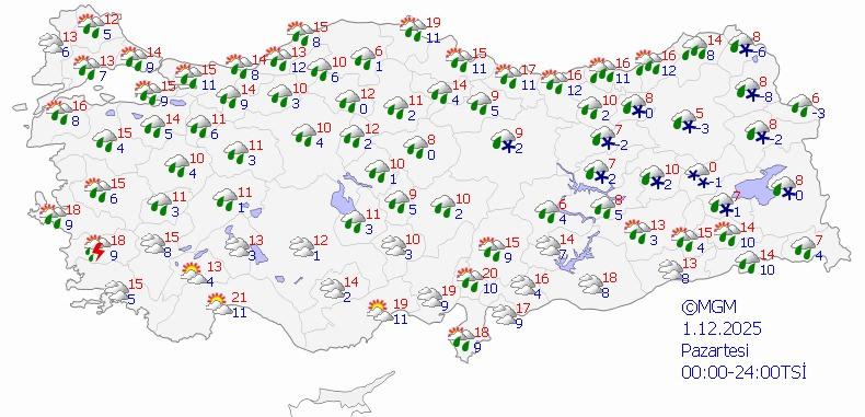 Parçalı ve çok bulutlu, sabah ve öğle saatlerinde yağmurlu, yüksekleri karla karışık yağmurlu