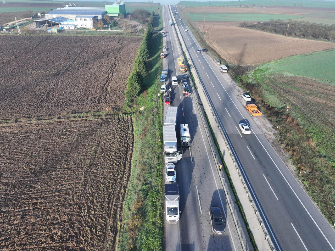 Edirne'de 10 aracın karıştığı zincirleme trafik kazasında 7 kişi yaralandı. Kaza nedeniyle kapanan yolun bir bölümü, araçların çekici yardımıyla kaldırılmasının ardından ulaşıma açıldı.