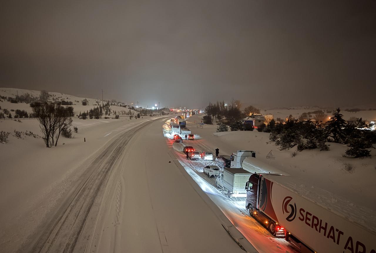 Yoğun yağış ve buzlanma nedeniyle ağır tonajlı araçlar rampayı çıkamayarak yolda kaldı. Tır ve kamyonların kayması sonucu yol çift şeritli olarak trafiğe kilitlendi.