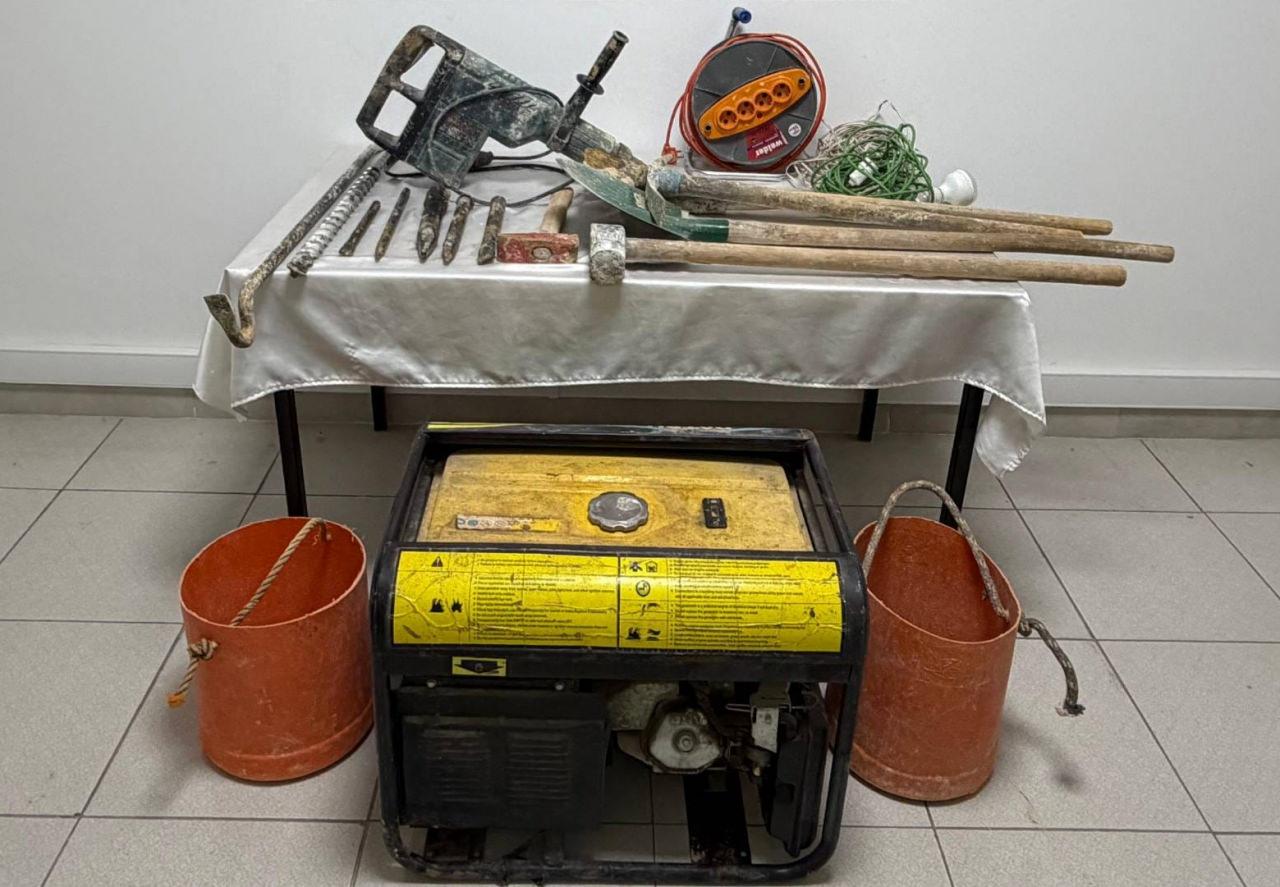 Şüphelilerin kazıda kullandıkları malzemelere el konuldu.