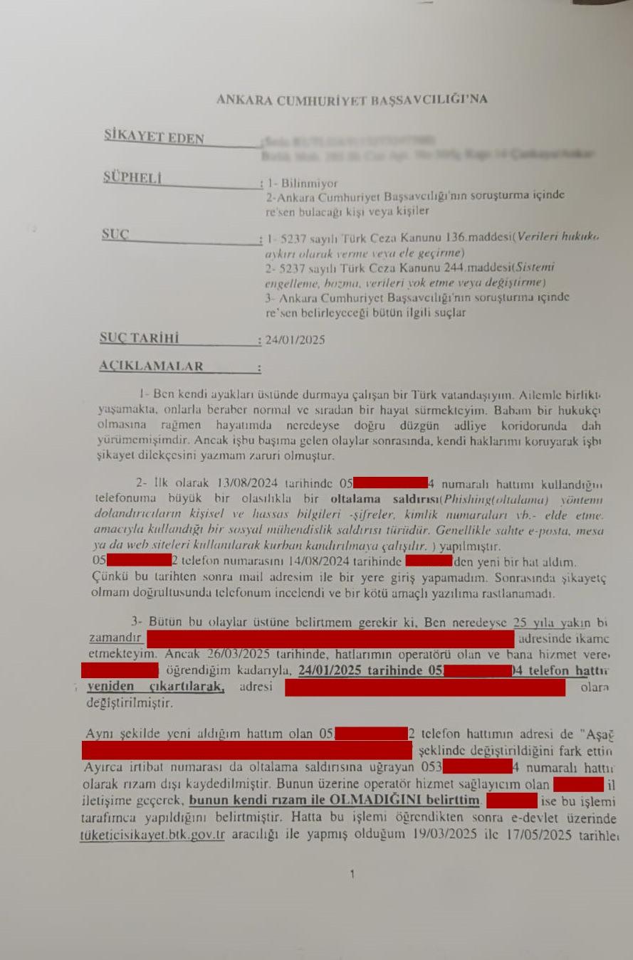 Siber saldırılara maruz kalan genç kadın Ankara Cumhuriyet Başsavcılığına yaptığı başvuruda kendi rıza olmadan adres ve bilgi değişikliği yapıldığını ve 28 Mayıs 2025 tarihinde kamu davası açmak üzere şikayetçi oldu.