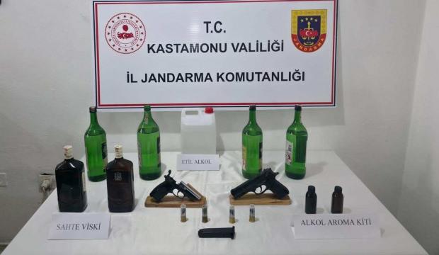 Kastamonu'da jandarma ekiplerinin düzenlediği operasyonda 83 litre etil alkol ve çok sayıda sahte içki ele geçirildi, 4 kişi gözaltına alındı.