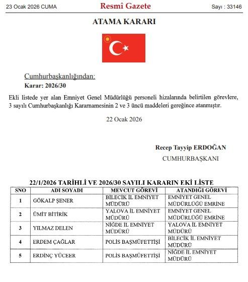 Cumhurbaşkanı Recep Tayyip Erdoğan'ın imzasıyla yayımlanan karara göre, Bilecik İl Emniyet Müdürü Gökalp Şener ve Yalova İl Emniyet Müdürü Ümit Bitirik Emniyet Genel Müdürlüğü emrine alındı.
