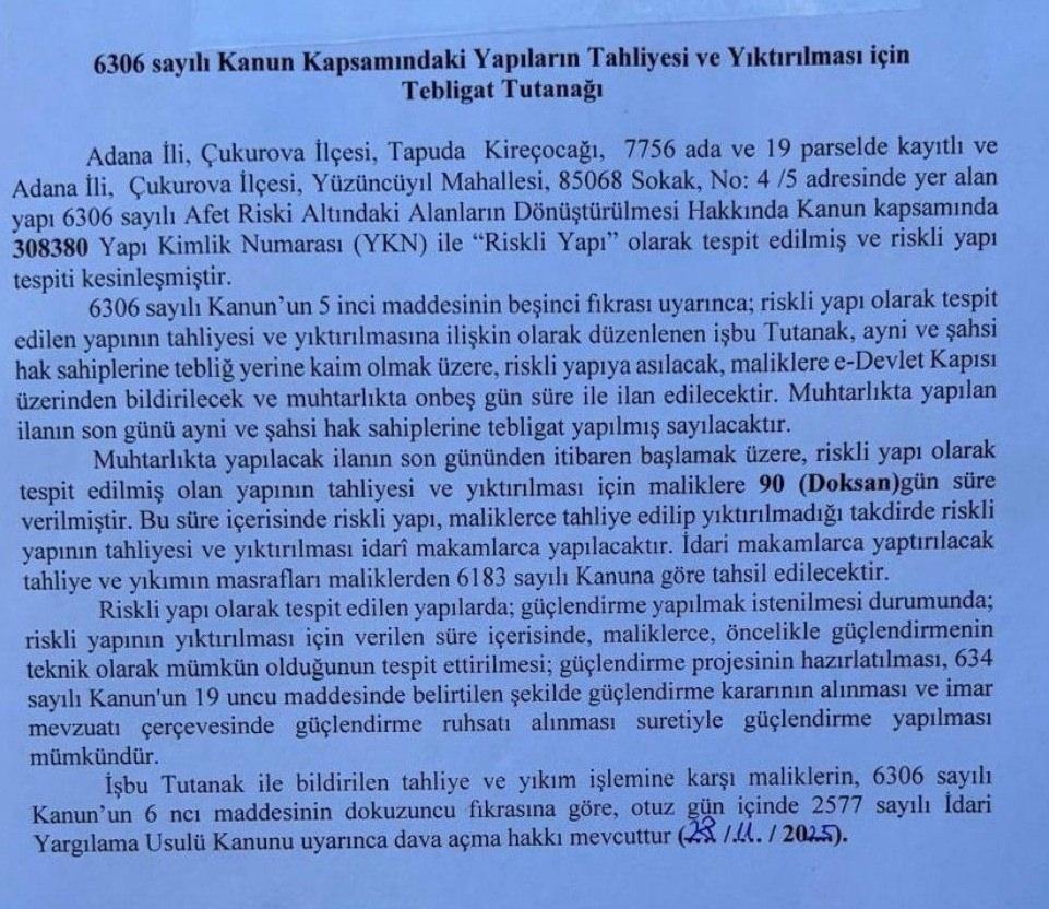 Çukurova Belediyesi teknik ekiplerinin başvuru üzerine yaptığı yerinde inceleme sonrası 3 Mart 2025 tarihinde hazırlanan raporda, yapıdaki tadilatın yapının statiğini bozacak nitelikte olduğu belirtildi. Ayrıca mevcut binanın bitişiğinde yaklaşık 12x6 metre ebatlarında betonarme temel atıldığı ve kolon filizlerinin bırakıldığının tespit edildiği bildirildi. Bu nedenle belediye işlemlerin 3194 sayılı İmar Kanunu'nun 32. maddesi kapsamında ruhsata aykırı olduğunu belirterek, yapı tatil zaptı düzenleyip inşaatı mühürledi.