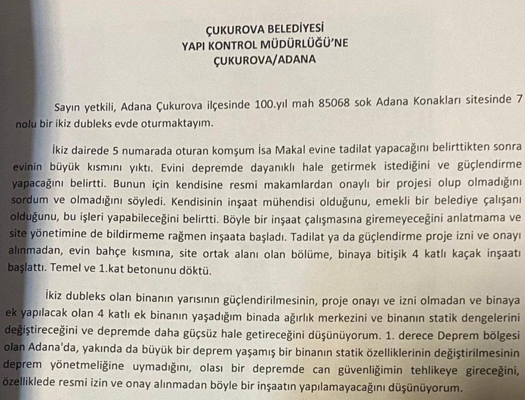 Şikâyet dilekçesinde, ikiz dubleks yapının yalnızca bir yarısında yapılan bu müdahalenin binanın ağırlık merkezini ve taşıyıcı sistemini değiştirdiği vurgulandı. Ayrıca doktor dilekçede 1. derece deprem bölgesi olan Adana'da, resmi izin ve proje olmadan yapılan bu tür bir uygulamanın deprem yönetmeliğine aykırı olduğu ve muhtemel bir depremde can güvenliğini tehlikeye atacağını ifade etti.