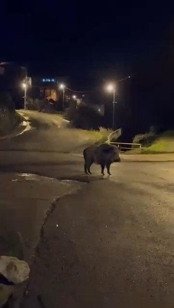 Evine giden bir kişi, bir anda karşısında yaban domuzlarını gördü. O anları cep telefonuyla kaydeden mahalleli, domuzlara saldırmak isteyen köpeğini durdurmaya çalıştı. Kısa süre mahallede dolaşan yaban domuzları daha sonra geldikleri istikamete gitti.
