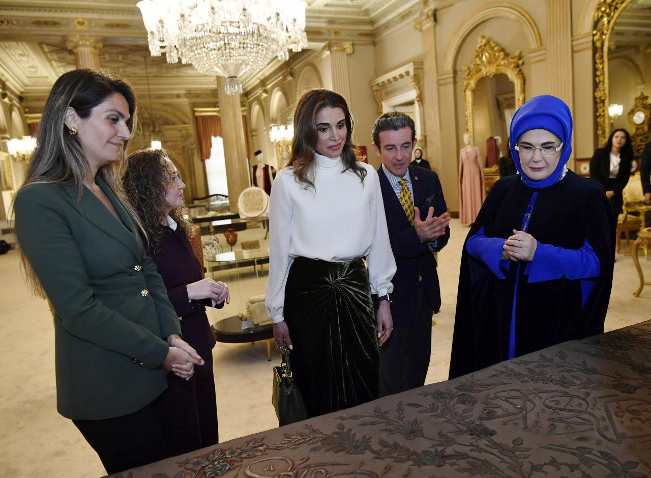 Emine Erdoğan ile Rania Al Abdullah, görüştükleri Dolmabahçe Sarayı'nda, Olgunlaşma Enstitüsü tarafından düzenlenen "Tabiatın Ahenginden Kültürel Hafızaya: Nakş-ı Zaman Sergisi"ni gezdi.