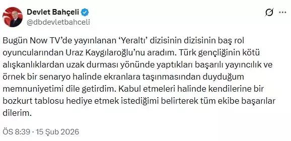 Bahçeli, sosyal medya hesabından yaptığı açıklamada şu ifadelere yer verdi: "Bugün Now TV'de yayınlanan 'Yeraltı' dizisinin dizisinin baş rol oyuncularından Uraz Kaygılaroğlu'nu aradım. Türk gençliğinin kötü alışkanlıklardan uzak durması yönünde yaptıkları başarılı yayıncılık ve örnek bir senaryo halinde ekranlara taşınmasından duyduğum memnuniyetimi dile getirdim. Kabul etmeleri halinde kendilerine bir bozkurt tablosu hediye etmek istediğimi belirterek tüm ekibe başarılar dilerim."