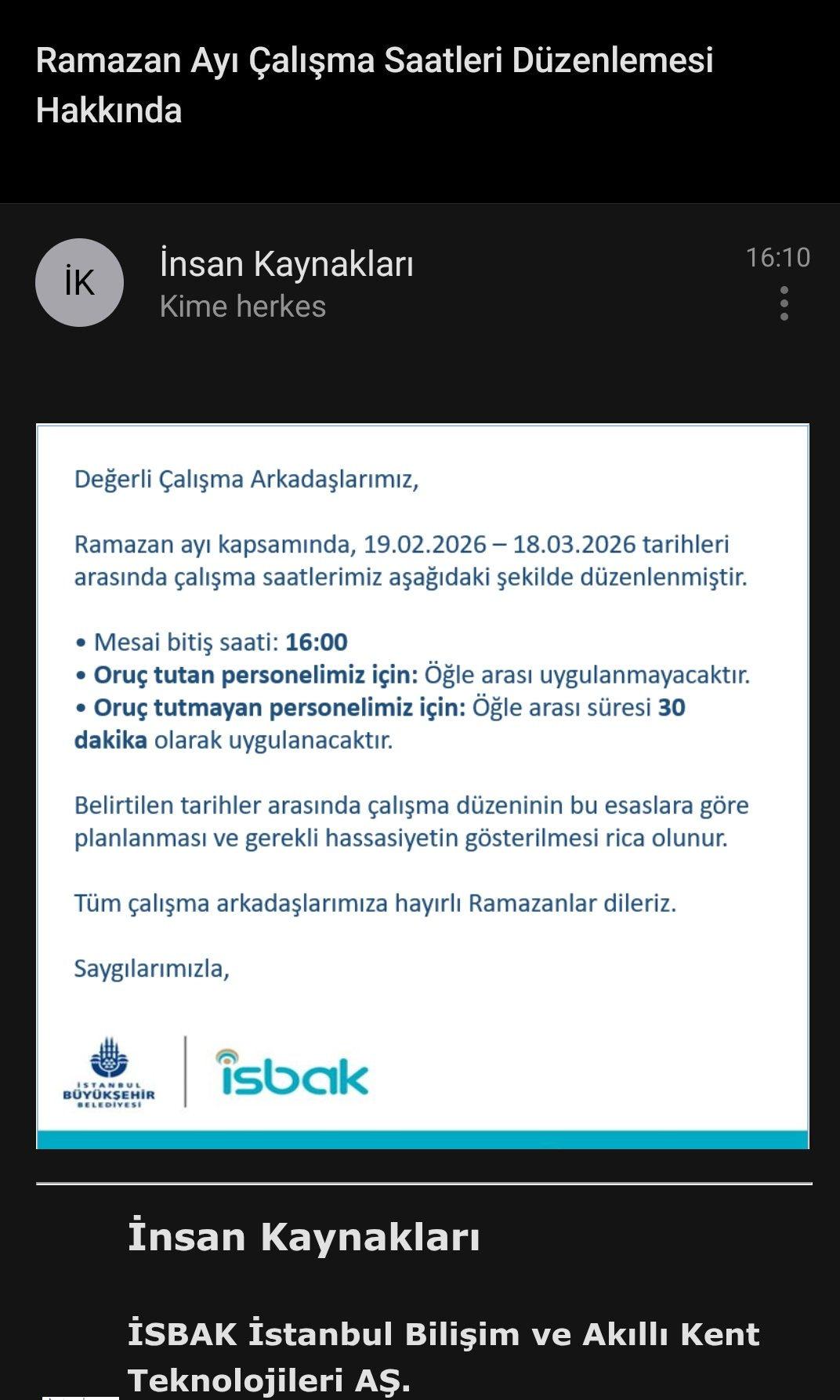 İSBAK’ta oruç tutan görevli personellerin Ramazan ayı boyunca oruç tutmayan çalışanlarına 30 dakika mola uygulanacağını ancak oruç tutan çalışanlarına ise molasız çalışma talimatı verdiği öğrenildi.